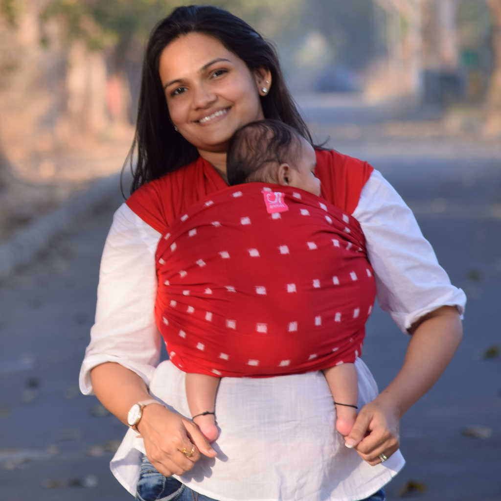 Ikat, or ikkat, is a dyeing technique used to pattern textiles that employs resist dyeing on the yarns prior to dyeing and weaving the fabric. Playing with this technique, an endearing pattern of uniform white squares spreads across the bright red cotton fabric used for the supportive body panel of the Double Ikat Red Hybrid Wrap as well the same radiant red forms the stretchy panel of this hybrid wrap.